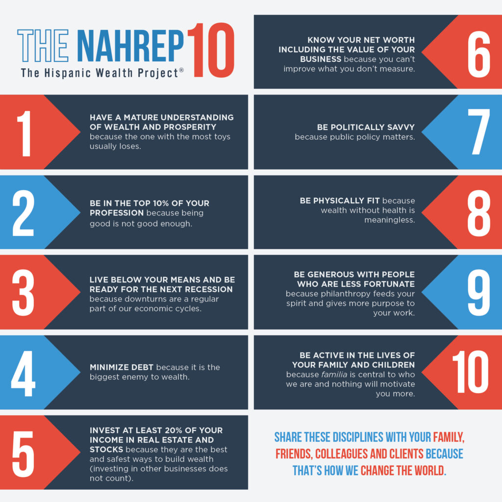 This mission led to the creation of the NAHREP 10 Disciplines—a set of core principles designed to help Latinos build wealth, increase net worth, improve financial literacy, and create long-lasting financial stability. These disciplines are practical, transformative, and urgently needed in our community.